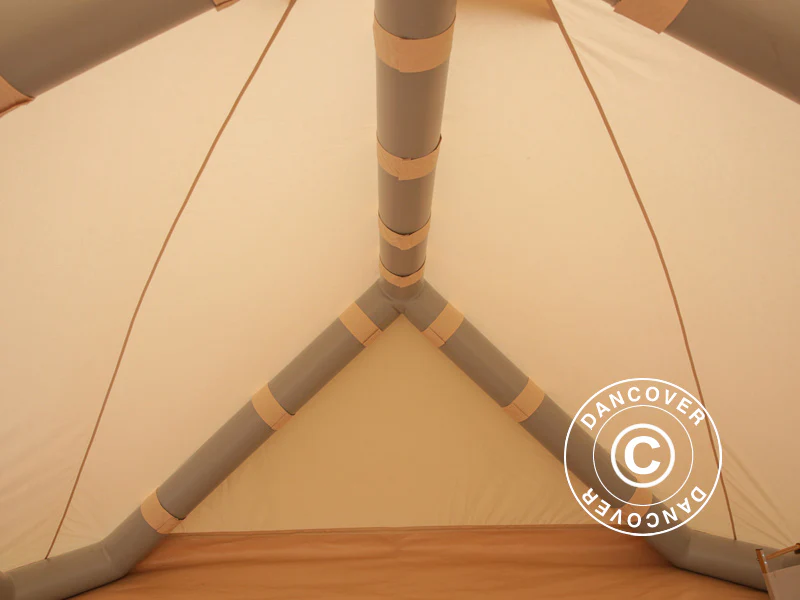 Dieses große und aufblasbare Glampingzelt ist ideal für ein außergewöhnliches Campingerlebnis geeignet oder wenn Sie einfach nur einen besonderen Raum in Ihrem Garten schaffen möchten. Verbessern Sie das traditionelle Campingerlebnis mit diesem einzigartigen Zelt und machen Sie Ihren Campingurlaub ein wenig stilvoller und komfortabler. Egal, wo Sie Ihr aufblasbares Glampingzelt aufstellen, Sie können sich auf ein außergewöhnliches Campingerlebnis freuen. Das Glampingzelt verfügt über eine Plane aus einer wasserdichten 200 g/m² Baumwoll-Polyester-Mischung mit einer Wassersäule von 500 mm. Die Bodenplane aus robustem PVC bietet eine Wassersäule von 3000 mm. Der Stoff ist schimmelresistent. Verwenden Sie das beiliegende elektrische Gebläse, um den Rahmen des Zeltes aufzublasen. Die PVC-Schläuche haben einen Durchmesser von 20 cm und die Plane wird daran mit weichen Bändern aus Oxfordstoff und Polyethylen befestigt.