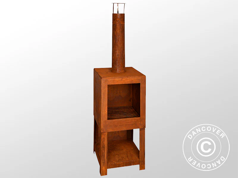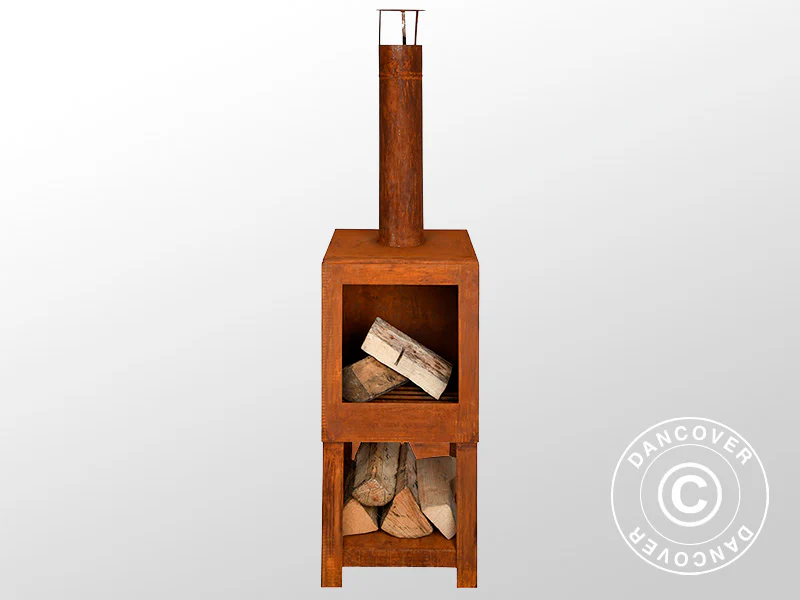Wenn Sie den Abend auf der Terrasse genießen möchten, ist ein Außenkamin hervorragend geeignet. Moderne, elektrische Terrassenheizer sind zwar sehr praktisch, aber sie sorgen nicht für dieselbe Atmosphäre wie ein Kamin oder Ofen. Der praktische Kamin schafft ein warmes und gemütliches Ambiente auf der Terrasse oder in Ihrem Patio. Er ist aus patiniertem Stahl gefertigt, verfügt über einen Lagerraum für Brennholz und spendet eine angenehme Wärme, wenn Sie sich abends auf der Terrasse aufhalten möchten. Der Rauch wird durch den Schornstein nach oben abgeleitet und Sie können dabei trotzdem den Duft von brennendem Holz genießen.