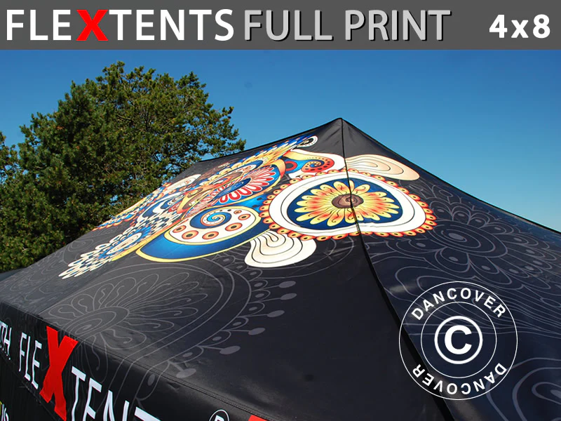 Bedruckte Dachplane mit Volant für das Faltzelt FleXtents® PRO mit einem vollflächigen Digitaldruck. Mit einem professionellen Faltzelt, auf dessen Dachplane Sie Ihr Design digital aufdrucken können, erhalten Sie eine äußerst effektive und optimal professionelle Branding-Lösung! Der Digitaldruck ist für Ihr FleXtents®-Faltzelt die nachhaltigste und exklusivste Lösung.