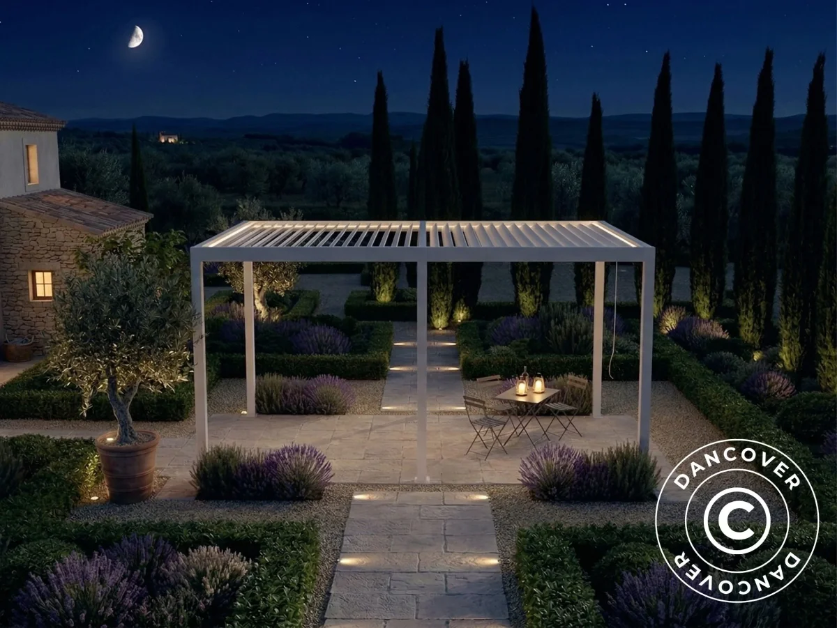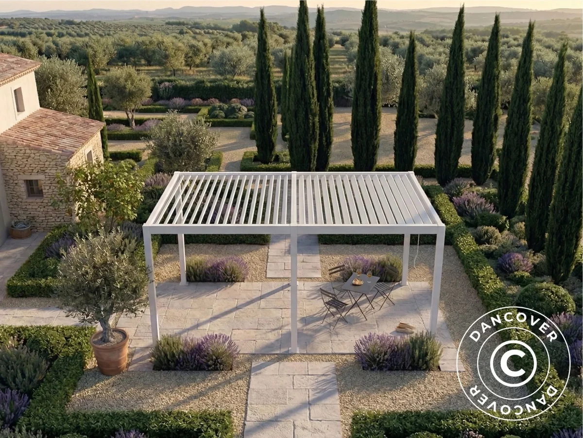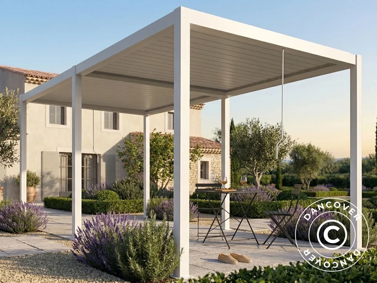 Dieser stabile und elegante bioklimatische Pavillon wird an den meisten Orten großartig aussehen – in Ihrem Garten, auf der Terrasse, am Pool oder anderswo. Das moderne Design passt überall, und Sie können ihn sowohl für Schatten als auch als Schutz vor leichtem Regen nutzen. Öffnen oder schließen Sie das innovative Lamellendach ganz einfach mit den Kurbeln im Inneren des Pavillons. Öffnen Sie die Lamellen, wenn Sie die Sonne genießen möchten, und schließen Sie sie wieder für Schatten oder Schutz vor leichtem Regen. Der San Pablo Pavillon ist wasserdicht* und UV-beständig. Vorhänge und Moskitonetze können separat bestellt werden, um den Pavillon geschlossener, privater und frei von fliegenden Insekten zu machen.