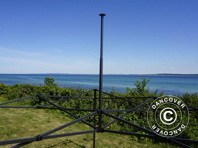 Die Konstruktion des Faltzelts Basic v.3 besteht aus einem robusten und stabilen Stahlrahmen mit Hammerschlaglackierung. Die Höhe des FleXtents ist auf 3 Positionen verstellbar, damit sie exakt Ihren Bedürfnissen entspricht.