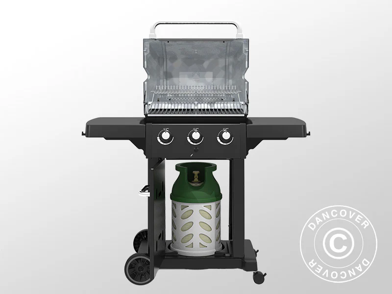 Der Grill ist mit drei Edelstahl-Dual-Tube™-Brennern, beidseitig verwendbaren Gusseisen-Grillrosten und einem Grillsystem mit Edelstahlwellen, Flav-R-Wave™, ausgestattet. Der Grill verfügt über einen Deckel aus Gussaluminium mit schwarzem Emaille-Einsatz, eine Gussaluminium-Grillkammer sowie ein einfach zu bedienendes Steuerungspanel, pulverbeschichtete Seitenablagen und einen Wagen mit Seitenverkleidungen und Tür. Robuste Räder ermöglichen ein einfaches Bewegen des Grills.