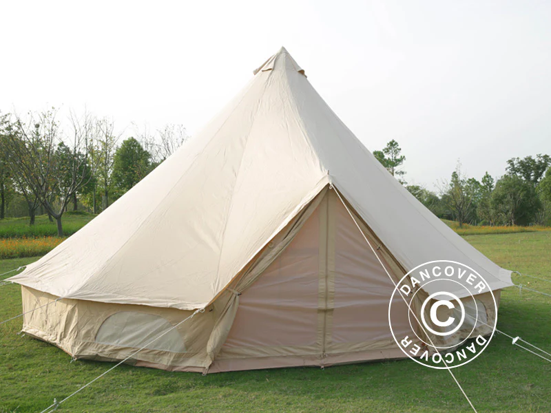 Die Glampingzelte bestehen aus wasserdichtem Baumwollgewebe 280 g/m² und haben einem hydrostatischen Kopf von 1000 mm. Der Zeltboden besteht aus aus Rip-Stop PVC 540 g/m² und hat einen hydrostatische Kopf von 3000 mm. Desweiteren sind alle verwendeten Stoffe schimmelresistent. Das Zelt verfügt über 6 Seitenfenster und 6 Belüftungsöffnungen an der Zeltspitze. Bitte beachten Sie die Dachhöhe von 3 m, die es Ihnen erlaubt sich bequem im Inneren des Zeltes zu bewegen. Zusammen mit dem Glampingzelt erhalten Sie Stangen, Zeltheringe, Abspannleinen und eine Tragetasche.