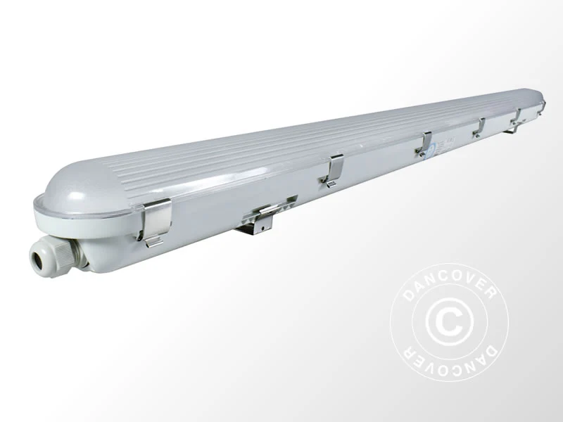 Industrial LED hermetic fixture with connected fixtures for storage tents, portable garages, workshops, warehouses, stables, visitor tents, and more. The fixtures are easy to install and you simply plug it in for them to start lighting up your warehouse, storage tent, and more. The fixtures are connected with a 3 m cable so you can hang them and get light inside the tent or warehouse in no time. With modern hermetic fixture inside your storage tent or warehouse, you can keep a nice overview, get around, and find what you are looking for at all hours. The high safety classification at IP65 makes it possible to use the fixtures almost anywhere. The LED will keep energy consumption at a minimum.