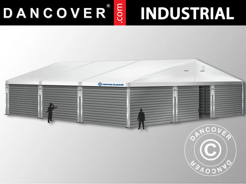 Die Lagerhalle in industrieller Stärke ist die perfekte Lösung für alle Branchen, in denen eine funktionale, flexible und temporäre Lagerkonstruktion benötigt wird. Dancover bietet Ihnen eine Lagerhalle der Spitzenklasse, die in Europa entwickelt und hergestellt wird und über einen stabilen, belastbaren Aluminiumrahmen, einzelne trapezförmige Stahlbleche als Seitenwände und eine hochleistungsfähige, flammfeste Plane aus 650 g/m² PVC verfügt. Die Plane ist feuersicher und gemäß EN 13501-1 zertifiziert.