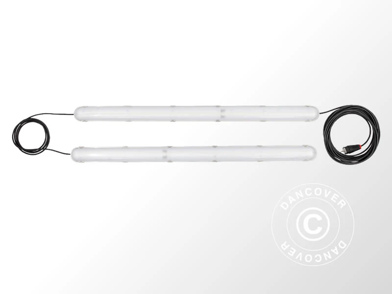Industrielle LED-Lichtleiste mit angeschlossenen Beleuchtungskörper, perfekt geeignet für Lagerzelte, Zeltgaragen, Werkstätten, Lagerhäuser, Ställe, Besucherzelte, etc. Die Lichtleisten sind leicht anzubringen und können einfach an eine Steckdose angeschlossen werden, damit Ihr Lager, Ihr Lagerzelt, Werkstatt, ect. immer gut beleuchtet wird. Die Beleuchtungskörper sind mit einem 3m langen Kabel verbunden, sodass Sie sie aufhängen und in kürzester Zeit für bessere Lichtverhältnisse in ihrem Zelt oder Lager sorgen. Mit modernen LED-Lichtleisten in Ihrem Lagerzelt oder Lager können Sie sich jederzeit sicherer fortbewegen und leichter finden, wonach Sie suchen. Die hohe Sicherheitsklassifizierung nach IP65 ermöglicht den Einsatz der LED-Lichtleisten fast überall. Die LED-Lichtleisten haben zudem einen sehr niedrigen Energieverbrauch.