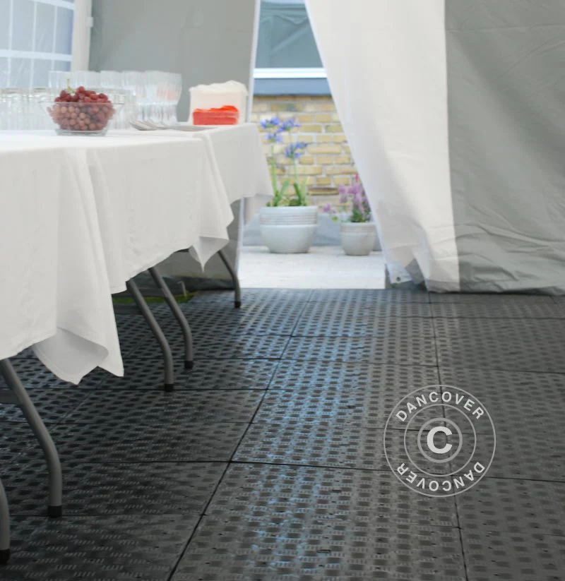 Der Boden ist überaus robust und widersteht sehr kalten und heißen Wetterbedingungen. Der Boden ist rutschfest und das Wasser fließt durch die kleinen Löcher auf der Oberfläche ab. Das innovative Verschluss-System ermöglicht es, den Boden ohne die Verwendung von Werkzeugen leicht und schnell auszulegen, wenn Sie eine Party im Zelt planen. Nach der Verwendung kann der Boden leicht demontiert und für die nächste Party verstaut werden.