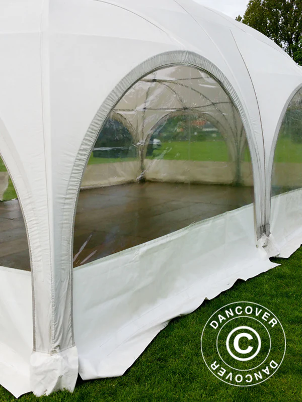 Kuppelzelt Multipavillon® Seitenwand mit Fenster. Das Fenster lässt Licht in das Zelt eindringen und gewährt den Personen im Zelt gleichzeitig einen schönen Ausblick. Alle verwendeten Materialien sind in einer professionellen Qualität und die verschiedenen Elemente können endlos kombiniert werden, indem 2 Zelte miteinander verbunden werden. Die flammhemmende und waschbare Plane schützt vor Sonne, Regen und Wind. Das Kuppelzelt kann sowohl professionell als auch privat genutzt werden und eignet sich perfekt für jede Veranstaltung, von der romantischen Hochzeit oder Konfirmation bis hin zu Ausstellungen, Produkteinführungen, Messen und Märkten. Die wunderschönen Bögen wirken romantisch auf der einen Veranstaltung und schlicht und praktisch auf der anderen, wenn viele Menschen auf Messen etc. durch sie hindurchgehen. Es ist möglich, Seitenwände mit oder ohne Fenster, Regenrinnen, Reißverschlüsse und Extramodule zu kaufen.