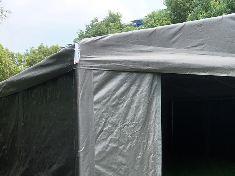 Die Plane besteht aus hochwertigem 300 g/m² PE (Polyethylen) mit einer langlebigen dreilagigen Konstruktion und beidseitiger Beschichtung. Ein integrierter Rip-Stop-Effekt verhindert das Ausbreiten kleiner Risse und verlängert die Lebensdauer des Lagerzeltes erheblich. Das Material ist UV-beständig und bietet zuverlässigen Schutz vor Sonne und Witterungseinflüssen, während es den gelagerten Inhalt schützt.
