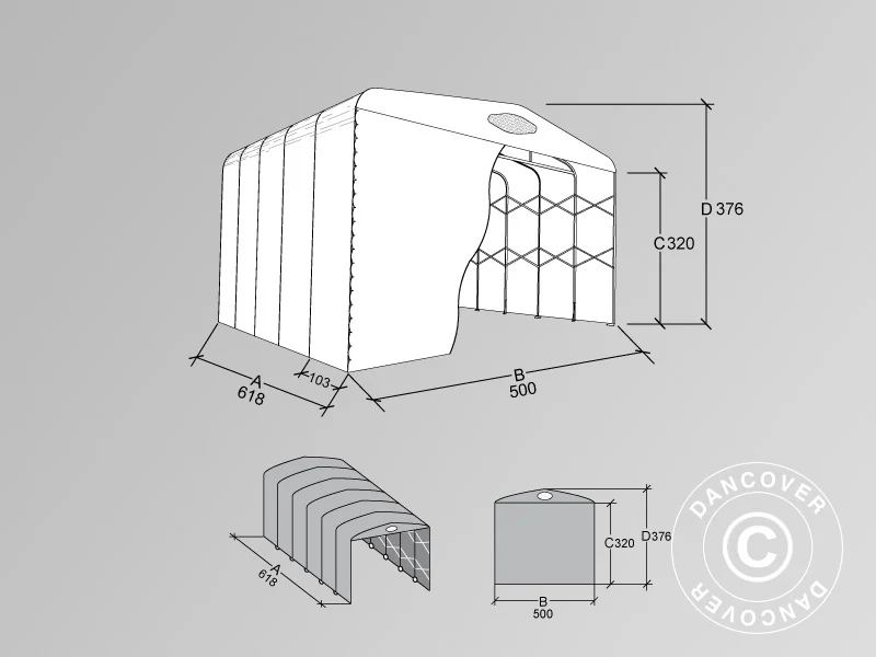 Innovatives und elegantes, italienisches XL-Lagerzelt für eine Vielzahl an Lageroptionen – insbesondere für große Fahrzeuge, andere große Objekte und aufgestapelte Waren. Das Lagerzelt Maxi Box von Dancover bietet vielfältige Möglichkeiten der Aufbewahrung – als Garage für Autos, Boote, Maschinen, Material, Fahrräder, Waren etc. Die flexible Faltstruktur verfügt über einen robusten, bogenförmigen Aluminiumrahmen, der eine flammfeste 550 g/m² PVC-Plane stützt. Die Schiebevorhänge – einer an jedem Ende – fungieren als Tür und ermöglichen einen leichten Zugang, wenn Sie Dinge einlagern oder beispielsweise mit einem Lastwagen aus dem Lager entnehmen müssen. Verzinkte Halterungen aus Stahl, die aus Sicherheitsgründen der Befestigung am Boden dienen, sind beigefügt.