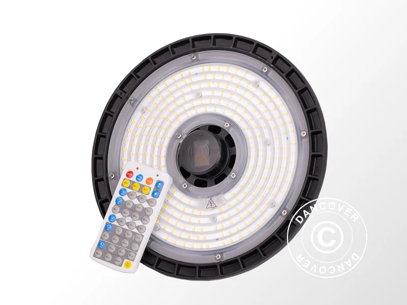 Industrial LED fixture with sensor and remote control for commercial or industrial facilities with high ceilings. Perfect for our large storage tents, storage shelters, and industrial storage shelters. This round and compact bay light is a simple yet effective solution for illuminating an area of approximately 70 m² with an excellent light of around 300 lux (illuminance). Many other solutions for storage facilities and warehouses only offer about 150-200 lux. The light is white (4000 Kelvin), and the CRI is about 80, which makes the light perfect for orientation and work inside the storage facility. The LED lamp is a solid and durable fixture in aluminium and polycarbonate made for industrial environments with the categories IK08 and IP65 for resistance and water. The lamp is easily operated with an enclosed remote control (batteries not included).