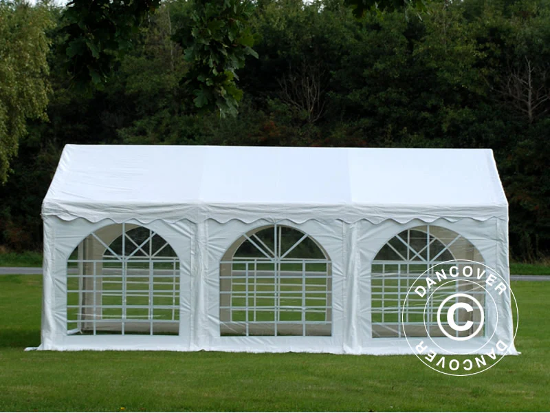 Unsere eleganten und klassischen Partyzelte in der Original-Serie und der bogenförmigen Ausführung (Original Arched) sind aus robuster Qualität und verfügen über eine 100% wasserfeste PVC-Plane mit großen Fenstern im georgianischen Stil an den Seitenwänden. Die schönen, klassischen Fenster sind extra groß und bieten einen fantastischen Lichteinfall. Darüber hinaus ist die bogenförmige Serie mit einem schönen und unverwechselbaren bogenförmigen Volant ausgestattet, der dem Partyzelt einen weichen und gewölbten Look verleiht. Dieses elegante Detail bietet Ihnen in Interaktion mit den großen Fenstern im georgianischen Stil ein exklusives und elegantes Partyzelt, das auf jeder Party, privaten oder professionellen Veranstaltung fantastisch aussieht. Der Rahmen ist aus stabilen verzinkten Stahlrohren hergestellt, die Sie ohne die Verwendung von speziellen Werkzeugen montieren können. Unsere PVC-Partyzelte werden komplett mit Rahmen und Plane sowie mit abnehmbaren Seitenwänden und Giebelwänden ausgeliefert.