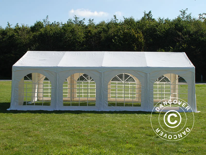 Unsere eleganten und klassischen Partyzelte in der Original-Serie und der bogenförmigen Ausführung (Original Arched) sind aus robuster Qualität und verfügen über eine 100% wasserfeste PVC-Plane mit großen Fenstern im georgianischen Stil an den Seitenwänden. Die schönen, klassischen Fenster sind extra groß und bieten einen fantastischen Lichteinfall. Darüber hinaus ist die bogenförmige Serie mit einem schönen und unverwechselbaren bogenförmigen Volant ausgestattet, der dem Partyzelt einen weichen und gewölbten Look verleiht. Dieses elegante Detail bietet Ihnen in Interaktion mit den großen Fenstern im georgianischen Stil ein exklusives und elegantes Partyzelt, das auf jeder Party, privaten oder professionellen Veranstaltung fantastisch aussieht. Der Rahmen ist aus stabilen verzinkten Stahlrohren hergestellt, die Sie ohne die Verwendung von speziellen Werkzeugen montieren können. Unsere PVC-Partyzelte werden komplett mit Rahmen und Plane sowie mit abnehmbaren Seitenwänden und Giebelwänden ausgeliefert.