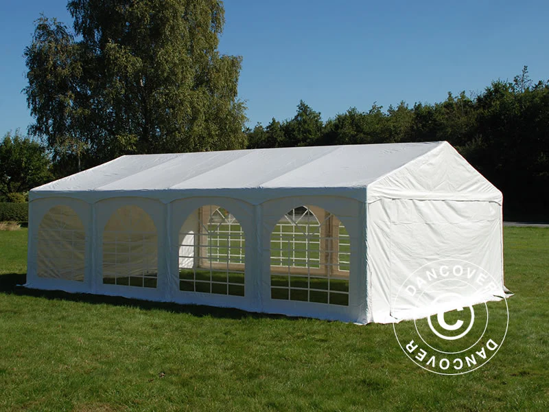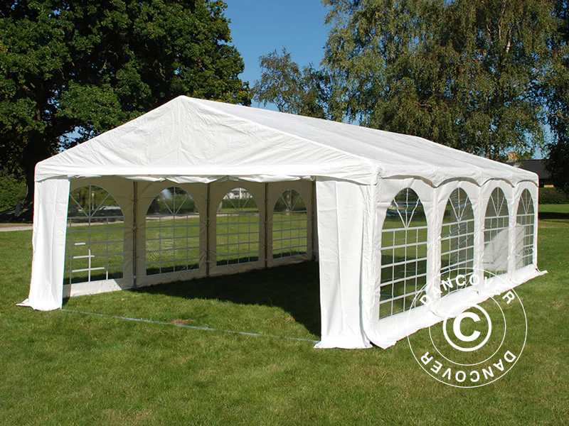 Unsere eleganten und klassischen Partyzelte in der Original-Serie und der bogenförmigen Ausführung (Original Arched) sind aus robuster Qualität und verfügen über eine 100% wasserfeste PVC-Plane mit großen Fenstern im georgianischen Stil an den Seitenwänden. Die schönen, klassischen Fenster sind extra groß und bieten einen fantastischen Lichteinfall. Darüber hinaus ist die bogenförmige Serie mit einem schönen und unverwechselbaren bogenförmigen Volant ausgestattet, der dem Partyzelt einen weichen und gewölbten Look verleiht. Dieses elegante Detail bietet Ihnen in Interaktion mit den großen Fenstern im georgianischen Stil ein exklusives und elegantes Partyzelt, das auf jeder Party, privaten oder professionellen Veranstaltung fantastisch aussieht. Der Rahmen ist aus stabilen verzinkten Stahlrohren hergestellt, die Sie ohne die Verwendung von speziellen Werkzeugen montieren können. Unsere PVC-Partyzelte werden komplett mit Rahmen und Plane sowie mit abnehmbaren Seitenwänden und Giebelwänden ausgeliefert.