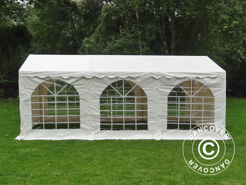 Die Plane ist gut verarbeitet und hat ein eingebautes Reißstop-Prinzip zum Schutz gegen Risse. Sprossenfenster an beiden Längsseiten sorgen für einen angenehmen Lichteinfall und eine gute Aussicht. An beiden Giebelseiten des Partyzeltes befindet sich ein Eingang.