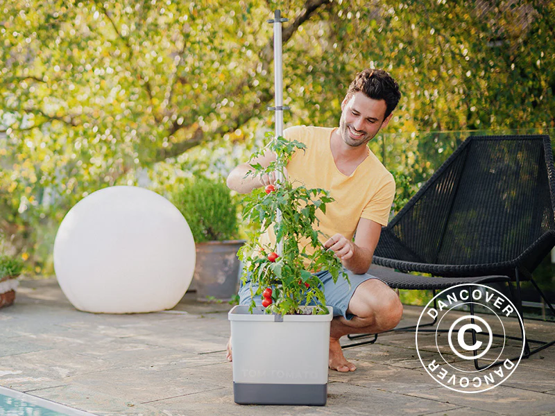 Wenn Sie denken, dass es kompliziert ist, Tomaten anzubauen, denken Sie noch einmal darüber nach. Mit diesem modernen Pflanzgefäß TOM TOMATO für den urbanen Anbau können Sie selbst angebaute Tomaten auf dem Balkon, der Terrasse oder im Garten anbauen und genießen. Der innovative Tomatenturm löst alle Probleme rund um den Tomatenanbau. Das integrierte Bewässerungssystem und die stabile Rankhilfe bieten den Tomaten alles, was sie für ein perfektes Wachstum benötigen. Befestigen Sie die Triebe einfach mit den Befestigungsklammern an die Rankhilfe und Ihre Pflanze wächst immer der Sonne entgegen. Aufgrund der idealen Größe des Wassertanks von TOM TOMATO muss dieser nur alle paar Tage mit Wasser gefüllt werden. Der TOM TOMATO Pflanzkasten für den urbanen Gartenbau ist hochgradig funktional und besteht aus hochwertigen Materialien, die lebensmittelecht, UV- und temperaturresistent sowie zu 100 % recycelbar sind.