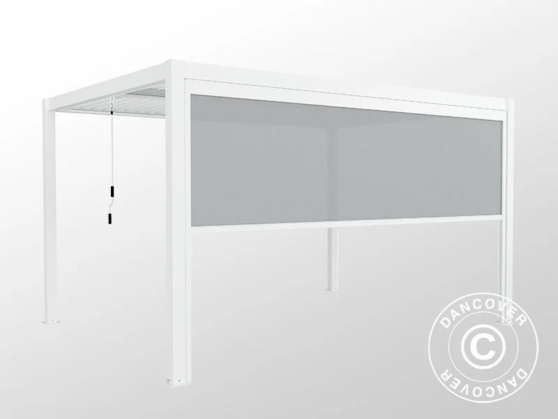 Die Seitenwand für unsere eleganten, modernen und minimalistischen bioklimatischen Pavillons San Pablo bietet Schatten und schützt Sie vor Wind, Regen und Sonne. Sie können bis zu vier Seitenwände an Ihrem Pavillon montieren. Vielleicht brauchen Sie Schatten und Schutz nur von einer Seite oder vielleicht möchten Sie den Pavillon komplett schließen, um einen geschlossenen Raum mit Schatten und ein wenig Privatsphäre zu schaffen. Die Seitenwände lassen sich einfach per Hand schließen oder öffnen. Das Öffnen oder Schließen der Wände erfordert nur minimalen Kraftaufwand und Zeit. Der strapazierfähige 420 g/m² Sunshine-Stoff bietet Schutz vor Wind und Schatten vor der Sonne und kann oben am Pavillon eingerollt werden.
