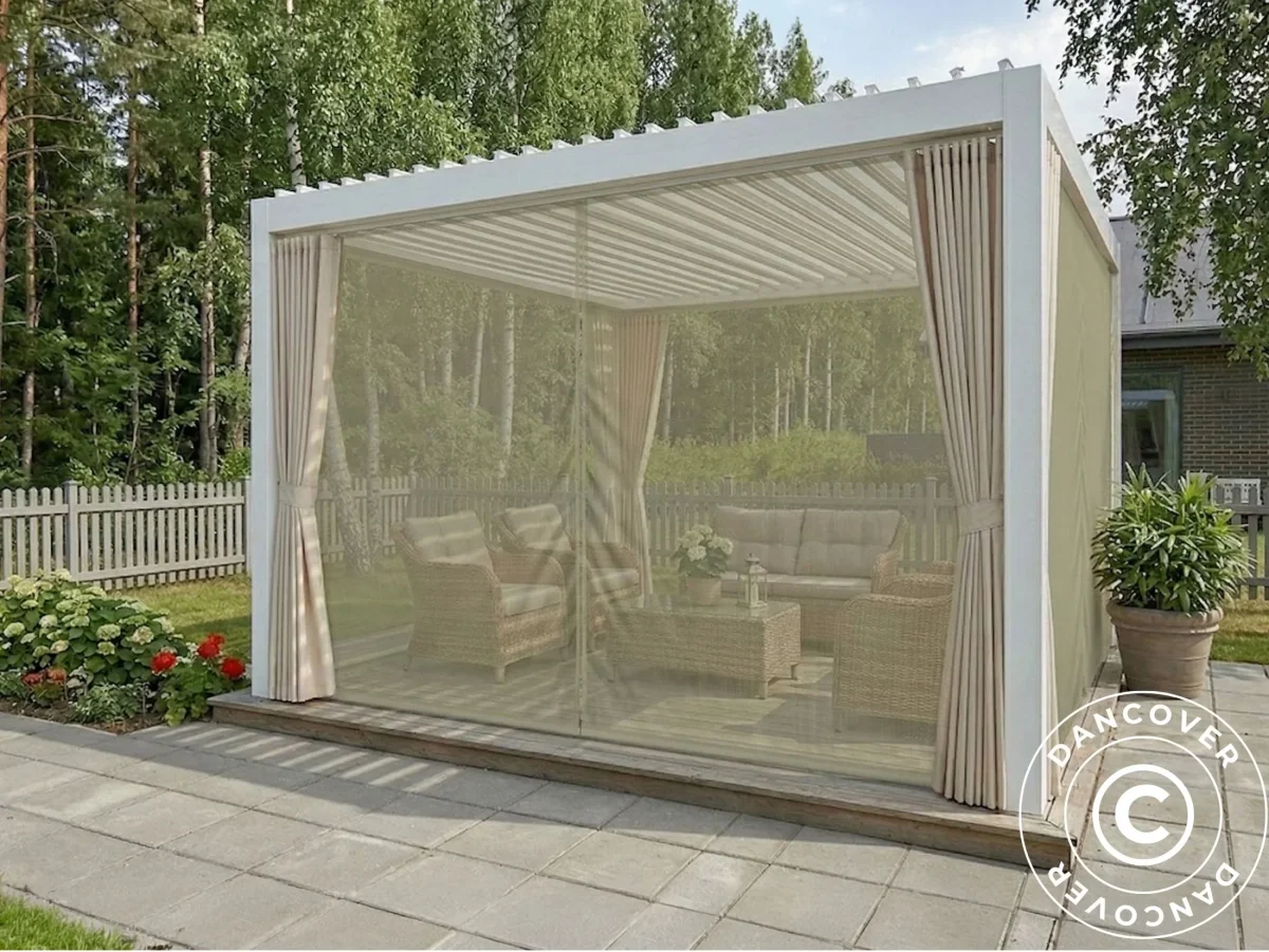 Vervollständigen Sie Ihre San Pablo bioklimatische Pergola Pavillon mit eleganten Seitenwänden und einem Moskitonetz. Dieses hochwertige Zubehörset ermöglicht es Ihnen, schöne Tage und Abende im Garten mit zusätzlichem Schutz vor Sonne, Wind, Regen und fliegenden Insekten zu genießen. Das moderne Design passt perfekt zur Pergola und bietet zusätzlichen Komfort und Flexibilität. Geeignet für San Pablo Alu+, Steel+ sowie Steel 3×3 m und 3×4 m. Die Vorhänge und das Netz bestehen aus Polyester und sind UV-behandelt (UV 50).