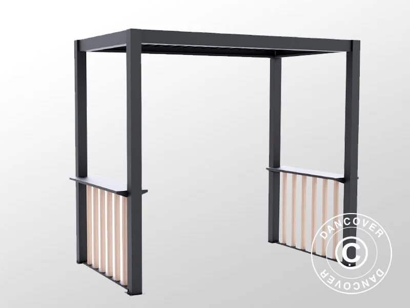 Elegante Seitenzäune für unseren beliebten Grillpavillon San Juan. Die Seitenzäune lassen den Pavillon noch eleganter und einladender wirken. Das Set besteht aus zwei Zäunen, einem für jede Seite der Pergola. Die Befestigung der beiden Zäune unter den Theken auf jeder Seite der Pergola ist einfach. Die Seitenzäune verfügen über einen Rahmen bzw. eine Platte aus Metall, die vertikalen Zaunstreben sind aus Kunststoff und in Holzoptik gestaltet. Sie können die Pergola noch weiter verschönern, indem Sie eine Lamellenwand bestellen und montieren, sodass Sie über eine geschlossene Pergola verfügen, in der Sie wundervolle Gerichte am Grill zaubern werden.