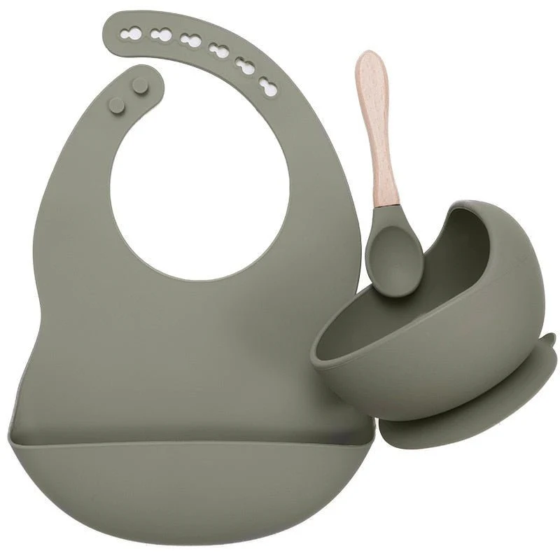 El kit incluye un cuenco y babero de silicona, así como una cuchara de madera y silicona.