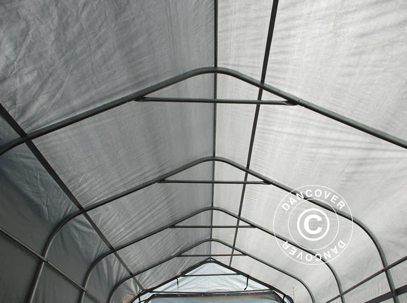 Zeltgaragen sind aus verzinkten Stahlrohren hergestellt und durch eine Oberflächenveredelung gegen Korrosion geschützt. Die Bodenstange wird mit den beigefügten Verankerungsstiften am Boden befestigt, um die Garage vor starken Winden zu schützen. Darüber hinaus verfügt die Plane auf beiden Seiten über Windschürzen, die als Schutz vor Seitenwinden dienen. Die Windschürze muss in den Boden eingegraben oder mit schweren Steinen oder einem anderen schweren Material bedeckt sein. Das Zelt kann mit Dehnschrauben auch auf Betonfundament montiert werden, wenn Sie eine längerfristige Lösung anstreben. Die Türen gleiten auf einer Schiene und können seitwärts geöffnet werden, wenn Sie die Zeltgarage öffnen möchten.