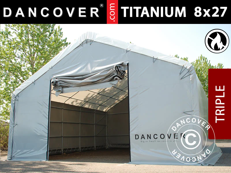 Die Zelthallen Titanium verfügen über einen stabilen Rahmen mit feuerverzinkten Stahlrohren, die mit einer Beschichtung gegen Durchrostung versehen sind, um die Langlebigkeit zu gewährleisten, welche die Dancover-Produkte so beliebt machen. Der Rahmen kann leicht mit widerstandsfähigen Schrauben und Muttern montiert werden. Der Rahmen wird durch Windkreuze aus Stahl für die Seiten- und Giebelwände verstärkt. Die ganze Struktur muss mit den beigefügten, robusten Bodenankern gesichert werden. Die elegante Plane der Zelthalle Titanium ist aus strapazierfähigem, flammfestem 600 g/m2 PVC hergestellt.