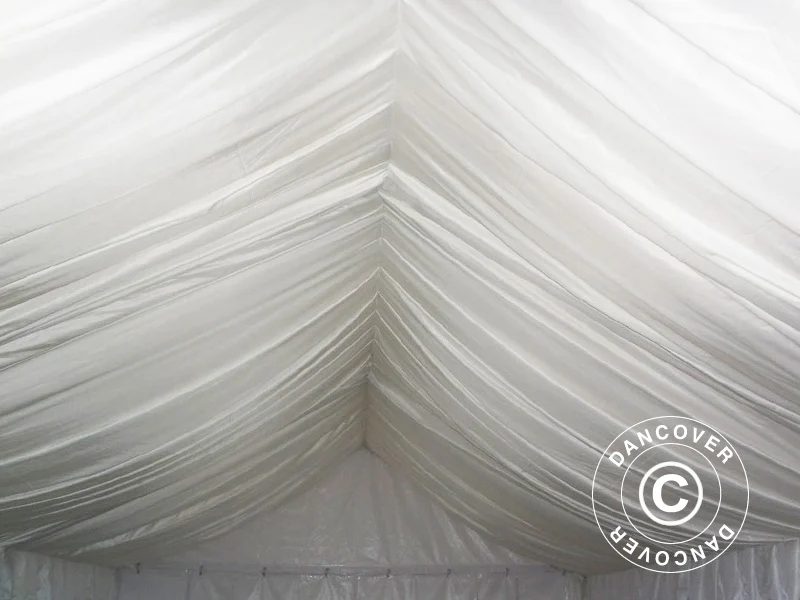 Suchen Sie nach der perfekten Decken- und Rahmendekoration für Ihr Partyzelt? Dieses weiße Zeltinnenhimmel-und Vorhänge-Set sorgt für die perfekte Partyzelt-Atmosphäre bei Hochzeiten und anderen Feierlichkeiten. Der Satin-Look verleiht dem Zelt eine exklusive Note und der Volant verbirgt dezent die Befestigungspunkte des Zeltinnenhimmels und den Zeltrahmen.